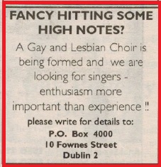 Glória, Dublin’s Lesbian and Gay Choir, was founded in October 1995. An ad placed in Gay Community News invited singers interested in forming a choir. About 25 people came along on that first night , 10th October – some who still sing with the choir – and today we have a singing membership of 60. The choir’s repertoire is wide ranging; from musicals to madrigals and from classical to camp. The songs are chosen sometimes to surprise, sometimes to challenge, but always to entertain!